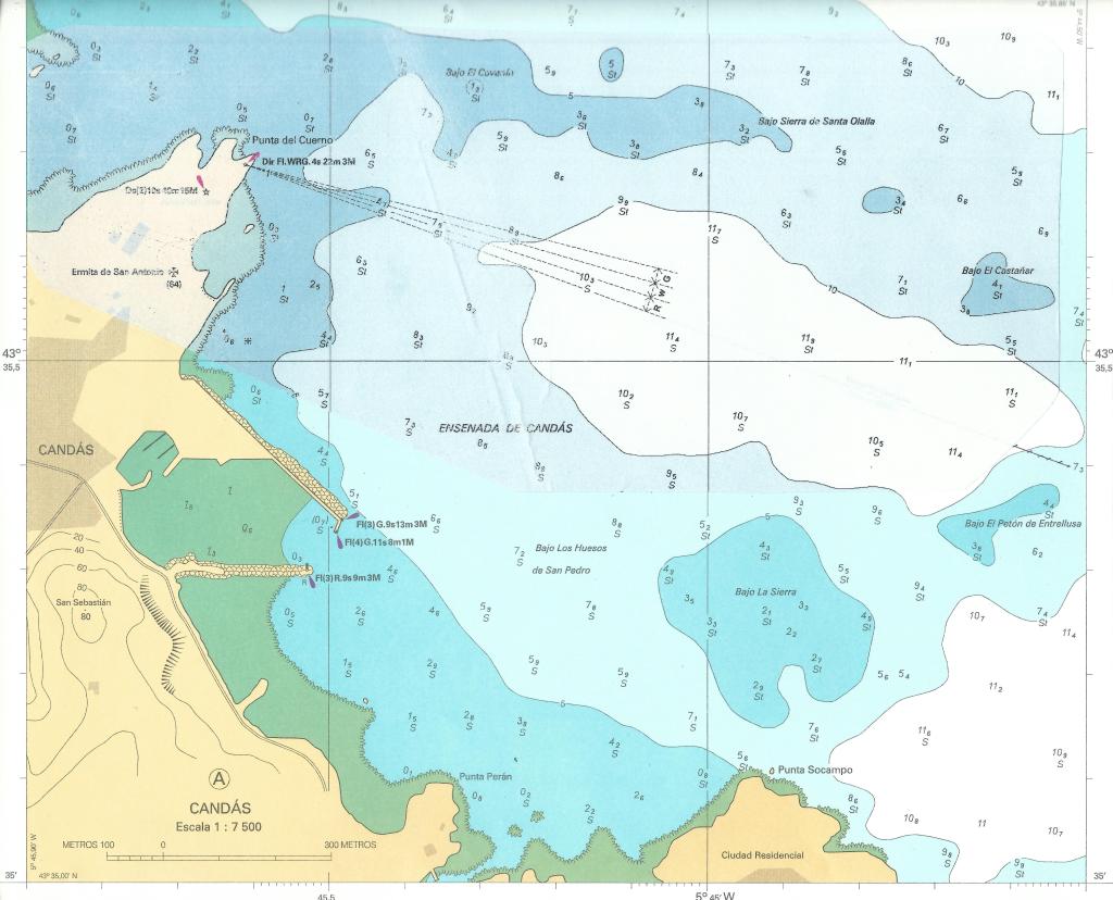 Los bajos descritos forman entre sí varios canales utilizables en buenas circunstancias y que conducen a un amplio manchón de arena que se extiende frente a Candás con fondos variables entre 6 y 9 metros en bajamar. El canal más franco, y único practicable con mar gruesa del N o NW, es el denominado El Carrero. La línea que determina pasa por el N del petón de Entrellusa y de La Sierra y por el S de La Castañar, por fondos de arena de 10 y 12 metros