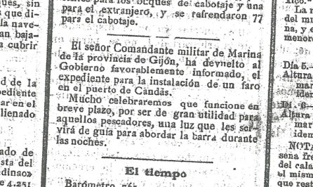 En el periódico El Noroeste – Diario Republicano de cinco de noviembre de 1899 se publicó la noticia de la instalación definitiva del faro del puerto de Candás, con una luz de color verde y un alcance de seis millas.